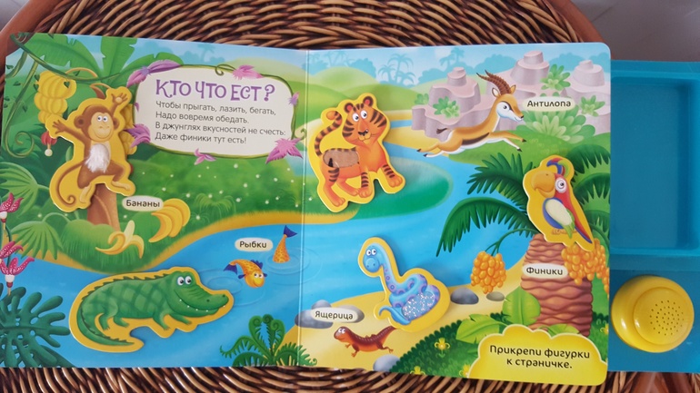"Такие далекие джунгли" - книжка с липучками, дочери нравится размещать их на разворотах, которые поделены на такие темы: кто где спит, кто что ест, кто чей малыш, кто где живет: