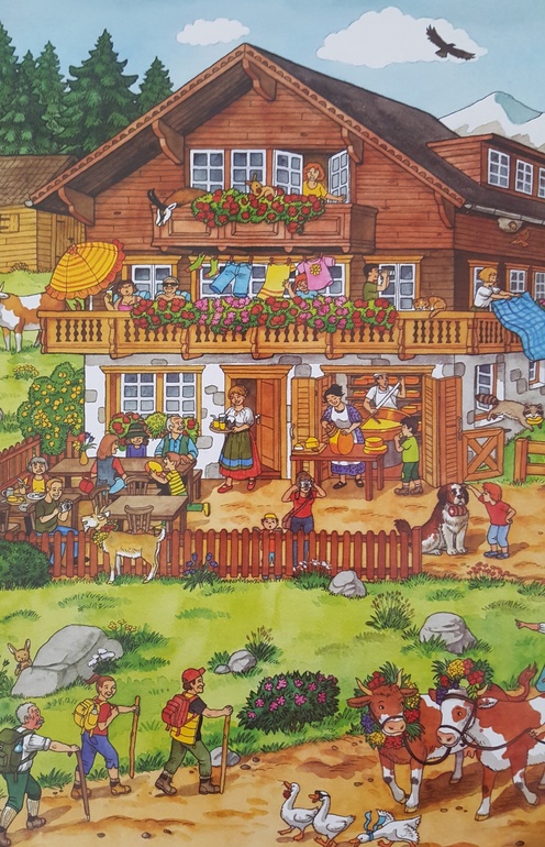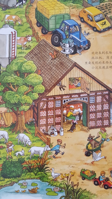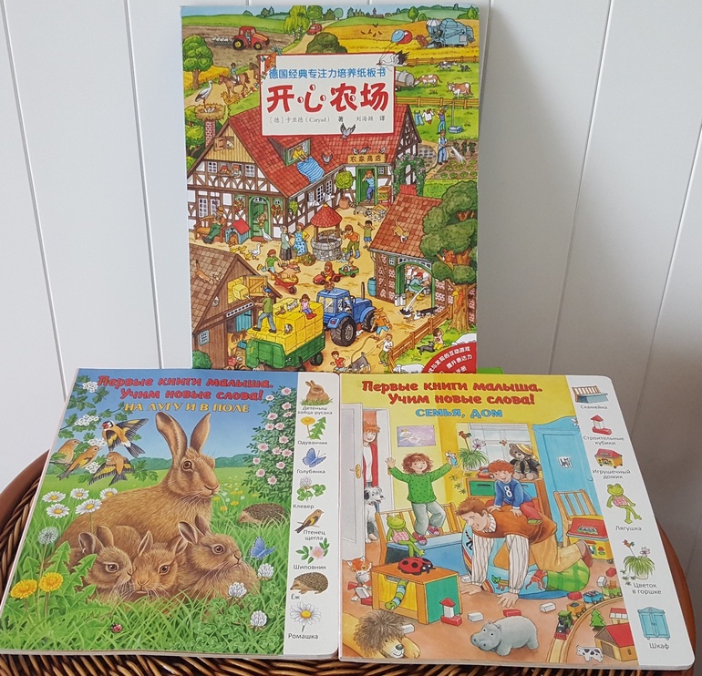 Наши книжки-смотрелки. Немецкий виммельбух про ферму на китайском языке - отличная книга, смотреть можно бесконечно, очень нравится и мне, и дочери. Думаю, еще долго будем рассматривать. Книжки "Учим новые слова" также очень хороши, "На лугу и в поле" поражает обилием разных птиц, иллюстрации очень красивые (художник Bob Bampton), а иллюстратор книжки "Семья и дом" - Анна Сьюз.