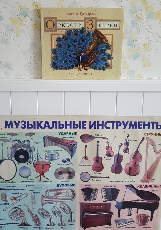 Стали часто рассматривать книгу "Оркестр зверей", находим и соотносим музыкальные инструменты из книги с плакатом, делаем это для общего развития: