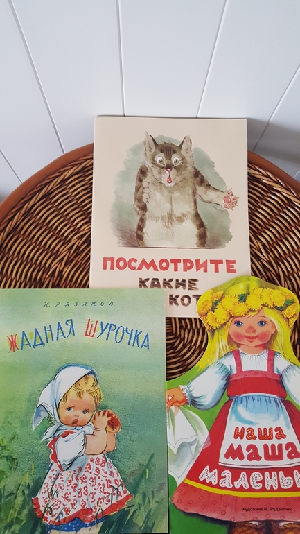 Сильно полюбила книжку-вырубку "Наша Маша маленька", мне кажется, в основном из-за иллюстраций, уж такие там девочки хорошенькие. Смысл "Жадной Шурочки" ей не совсем понятен, а если честно, то и мне тоже. Но слушает внимательно и рассматривает с интересом. Книжка "Посмотрите, какие котята" нам вновь стала интересна на волне знакомства с новыми словами, например, хорошо стала понимать значение слова "воришка".