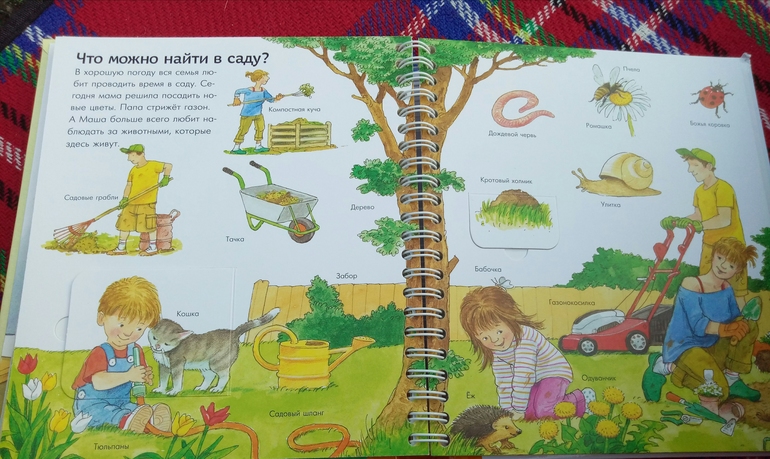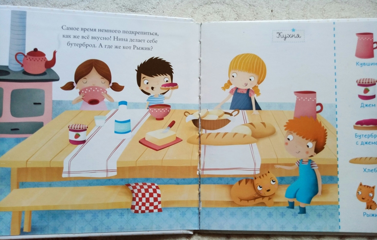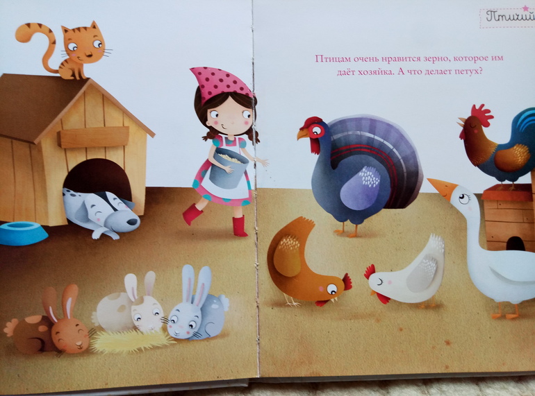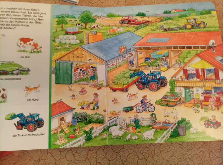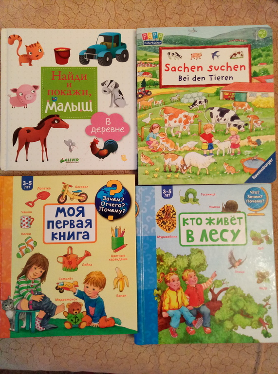 Почти виммельбух от Клевера, очень милый, Найди и покажи, малыш В деревне у нас очень давно.Вообще в этой серии Растем вместе уже много позиций, мне еще нравится Времена года,думаю пока купить не купить) а эту мы скоро перерастем уже.. Мне кажется, идеальный вариант для знакомства с виммелями. Рисунки приятные, крупные, добрые, нет мельтешения и загромождения деталями. Рисунки немного мультяшные, но мне они больше нравятся, чем в серии Найди и покажи. Книга небольшого квадратного размера,удобно брать с собой, тоненькая, но на удивление много разворотов.Темы как раз доступные для малышей, домашние животные, ну и трактор опять ) по краям нарисованы предметы, которые нужно найти на основном рисунке. И есть замечательный рыжий котенок, которого можно найти на каждом развороте.