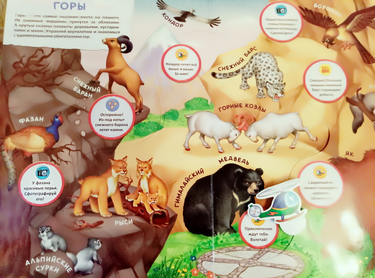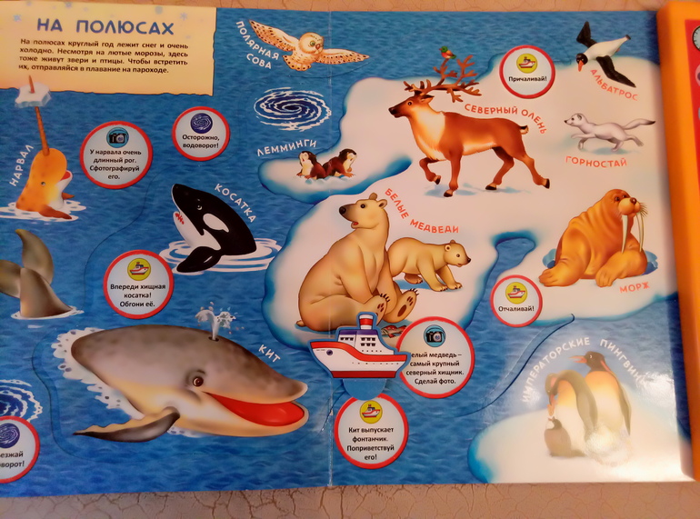 Вот самая мальчиковая звуковая книжка) потому что тут транспорт, причем разнообразный. И за что я особенно люблю такие книги у азбукварика, что играя, разлекаясь, можно и полезную и нужную информацию усвоить. В этой представлены несколько природных зон обитания, по которым движется какой либо транспорт. Транспорт можно поднять в вертикальное положение и возить его по всему развороту, а рисунки в виде знаков подскажут, на какую звуковую кнопку надо нажать. Всего 10 кнопок. Звуки разнообразные, и щелкание фотоаппарата, и плеск воды, и гудение парохода, и даже зыбучие пески есть.