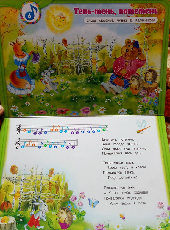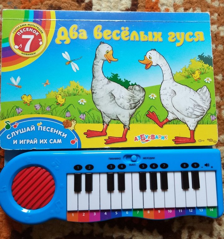 Это одна из самых первых музыкальных книг, и до сих пор самая любимая!Купила я ее ровно год назад, и как же сын под нее тогда зажигал) сам песенку включал и натанцевывал) веселил нас во всю) сейчас уже не танцует, но музыку включать любит) вообще я очень хотела купить другую, Вышла курочка гулять, отзывы были очень хорошие, но ее на тот момент не было, поэтому выбор пал на эту. И ни разу не пожалела. У фортепьяно два режима, в одном при нажатии на клавишу играет,песенка, один куплет и припев, всего 7 песенок.