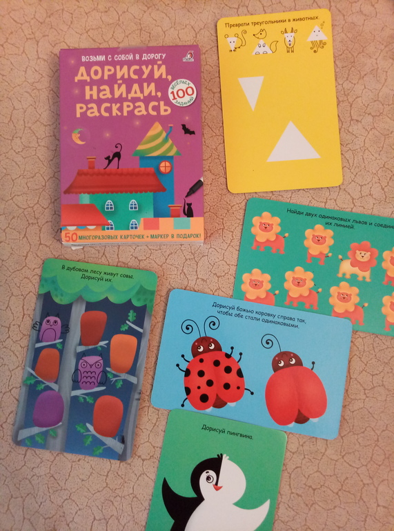 Мой ребенок очень любит это дело) и для пальчиков полезно) кстати, старшая вот решила половину заданий и не стерла ничего, а зачем, говорит, я же уже сделала? а то, что за ней еще люди есть, как то не подумала) но даже спустя несколько дней все замечательно стерлось) вообщем, отличнейшие отвлекательные карточки с разнообразными заданиями. И главное, память, логику и фантазию развивают.
