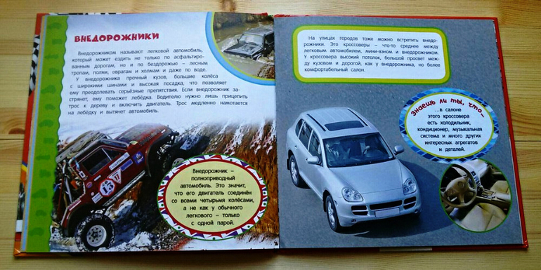 Брала эту книгу сыну на вырост, но что-то из нее мы читаем уже сейчас. Информации немного, она простая, но интересная. Думаю, оптимальный возраст для этой энциклопедии три-четыре года. Она хорошо подойдет для первого знакомства с устройством автомобиля и с большим разнообразием различных видов транспорта.