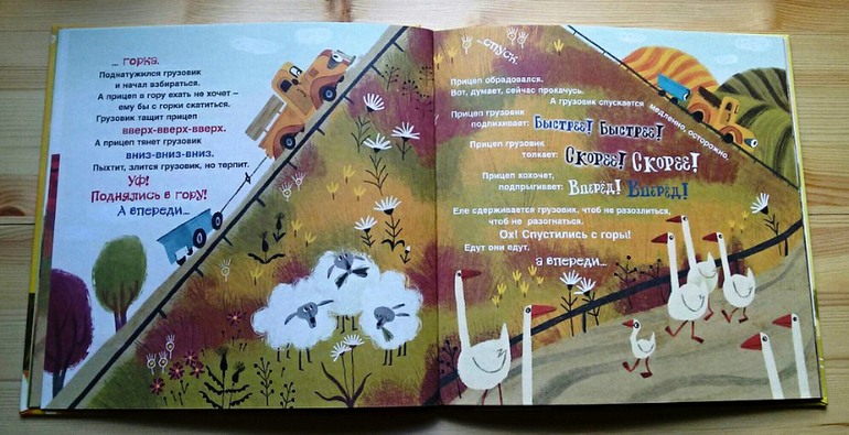 С дочкой у нас книга не пошла ни в два, ни в три года. В два она еще не могла прослушать ее полностью, ей не хватало терпения. А в три ей были интересны уже другие сюжеты. Как только начинались постоянные повторы: грузовик едет, прицеп едет, грузовик свернул, прицеп свернул, она закрывала книгу и просила читать другую. Так мы ее до конца с ней и не прочитали.