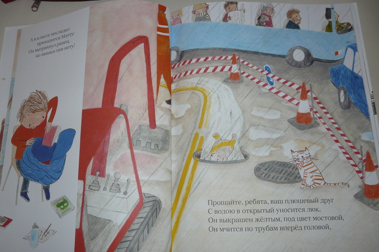 Почему эта книга?Моему ребенку очень понятен сюжет,т.к живем в Испании и тут в детских садах есть такая же традиция,что в классе есть "домашнее "животное ,у нас в первом классе был бегемот,во втором жираф.Дети в первом триместре выполняют разные задания на тему этого животного,и по пятницам ,кто-то берет его домой на выходные.Книга именно про это, в один день медвежонок выпал у мальчика из рюкзака и пережил много приключений. В отличии от других книг автора,тут нет "юмора",книга спокойная ,без претензии на уникальность.Иллюстрации выполнены новым для нас художником Ребеккой Кобб, ее же рисунки можно увидеть в книге "Бумажные куклы"
