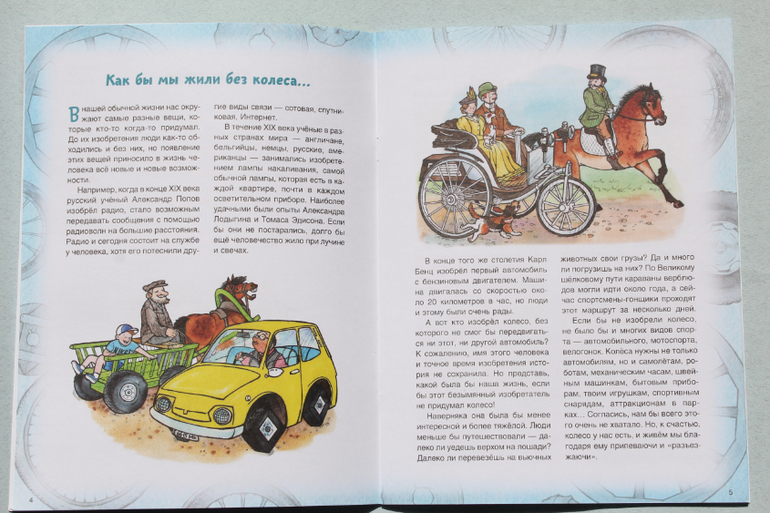 Эта тоненькая книга в 24 страницы - настоящий кладезь для любителей техники! Тут рассказывается и про первые поезда, и про двигатели, и про метро, и про электрички, про штурвалы самолётов и кораблей, про велосипеды и мотоциклы, ну и конечно же про автомобили. Я теперь даже знаю историю изобретения роликов, скейтбордов и гироскутера!