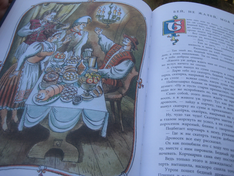 Почему я говорю: "Одолел", а потому что сказок там ну очень много! И некоторые из них очень, очень длинные. А еще и шрифт мелкий. Я даже сначала не хотела ему давать читать самостоятельно - за зрение опасалась, мы же и так в очках читаем... Но охота пуще неволи, даже прерваться не захотел, переключиться на что-то другое.