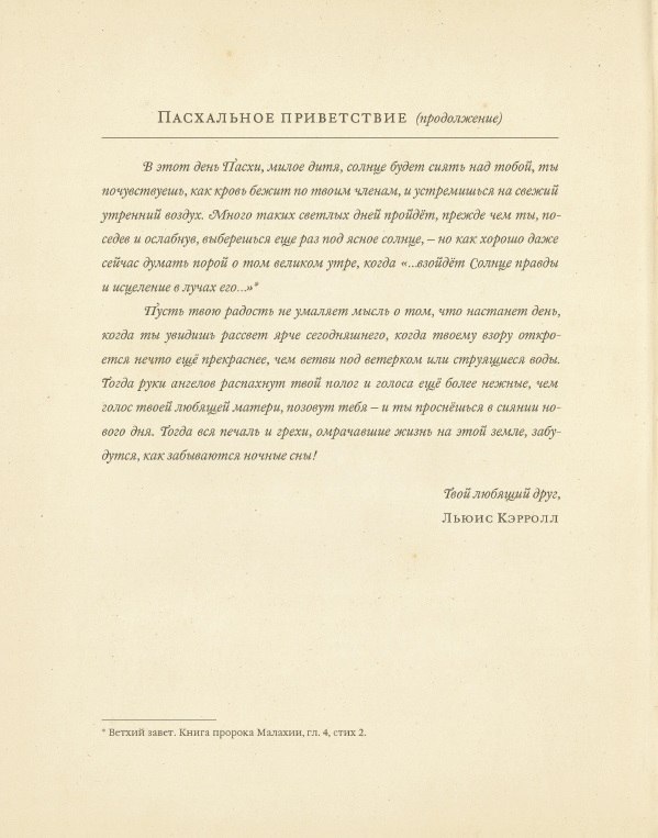 Обложку книги нарисовала Гертруда Томсон. Книга подготовлена на основе английского издания 1890 года. Именно в таком виде книга впервые издаётся на русском языке. Как и в оригинальном издании, в нашей книге приводятся: вступительное стихотворение Льюиса Кэрролла «Милая детская», его предисловие, адресованное матерям, а также приложения - «Пасхальное приветствие» и стихотворение «Рождественское послание».