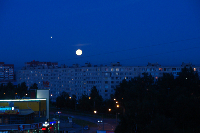 Луна огненным диском поднимается между домами и парит уже над! Звездочка в небе - самолет, летит на посадку в Пулково... По вечерам их особенно много... Мерно гудят и покачивают крыльями, отблески огоньков...