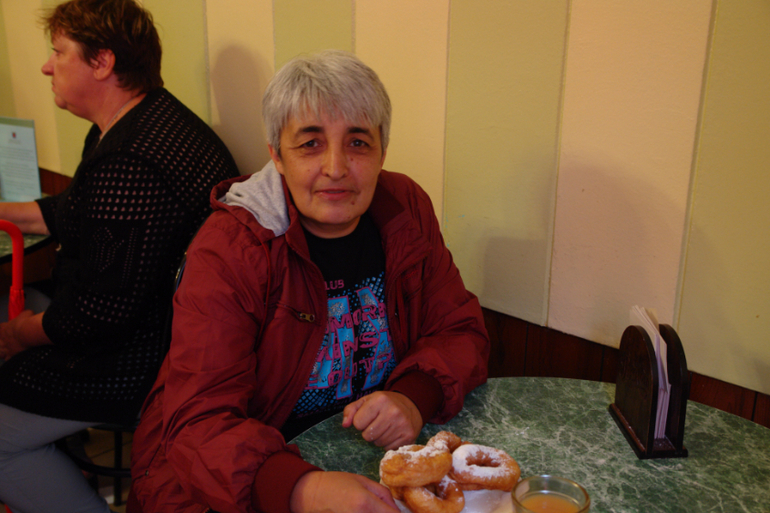 Говорим, говорим, много! Так много, что невозможно! Спросить, успеть, ничего не забыть! Пышки в Петербурге! Атмосферно)Кажется, в этой "Пышечной" собираются все) На обед сотрудники близ лежащих офисов, иностранные туристы, подружки на чашечку кофе, как из пионерского лагеря...Сто лет не пила кофе с молоком, да еще и сладкий) Потом временное затишье и только звук отхлёбывания кофе, и причмокивания от сладости пудры на пончике... Опять наплыв народа... тишина...