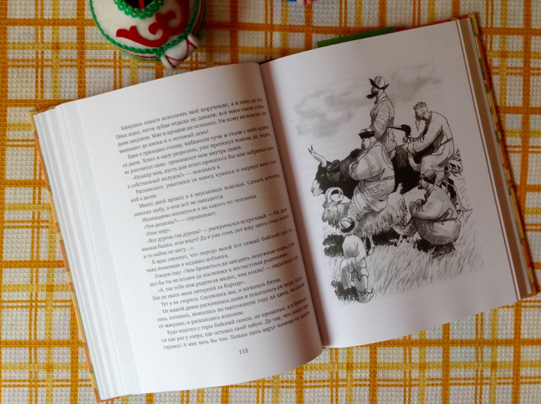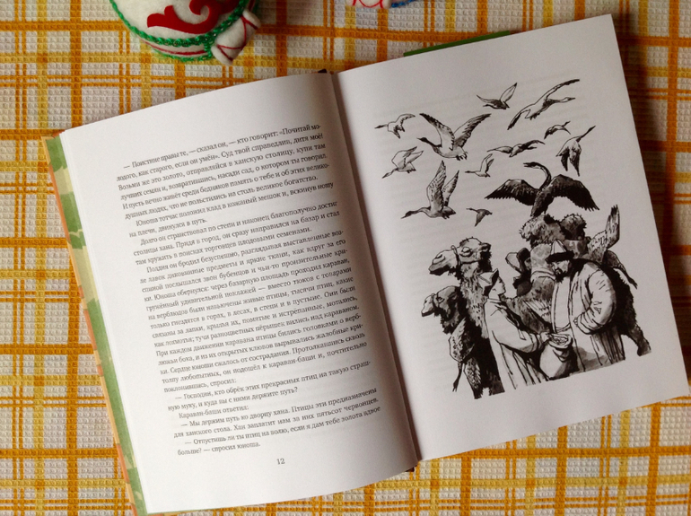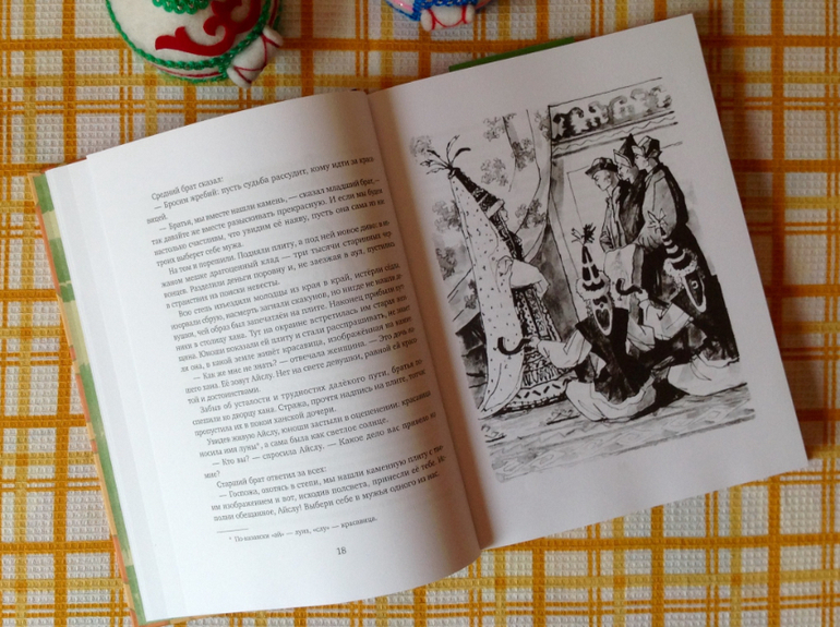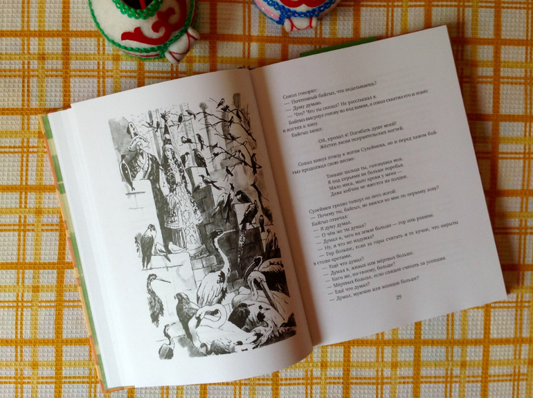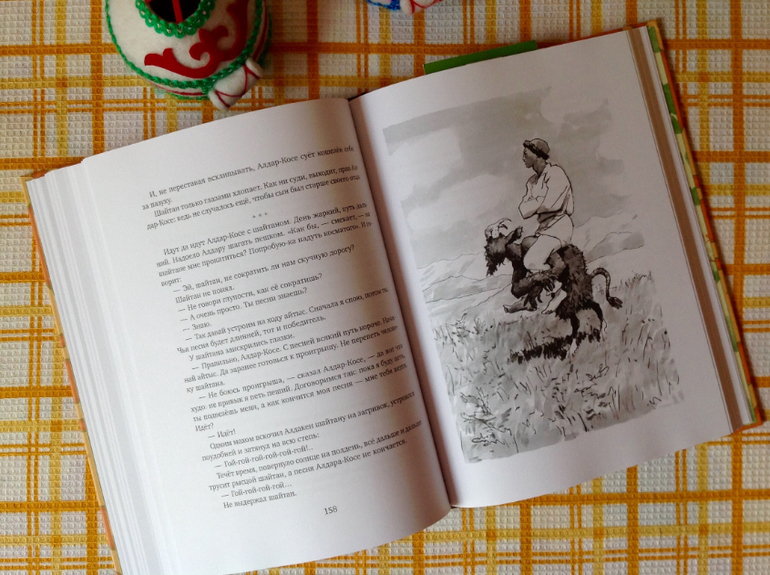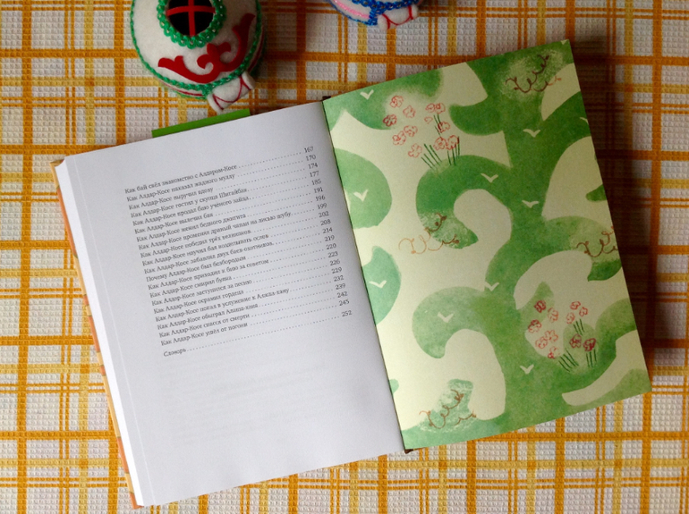 Сначала идут длинные сказки по 2-3 страницы, потом как я сказала сказки о животных и вторая часть после сказок- это небольшие притчи об Алдар-Косе безбородом насмешнике. Этакий казахский Ходжа Насреддин и Робин Гуд. Притчи короткие на 1-2 странички. Очень типовые о том как умный и хитрый Алдар-косе вершил правосудие. Обманывал богатых и помогал бедным.