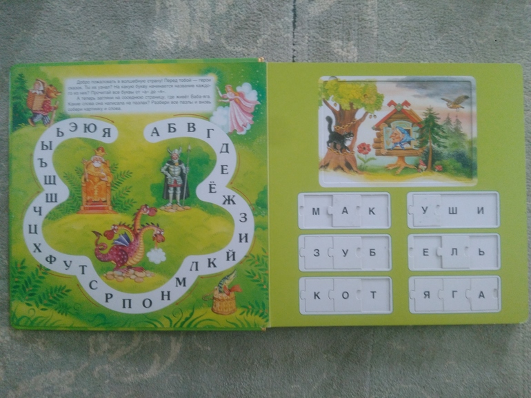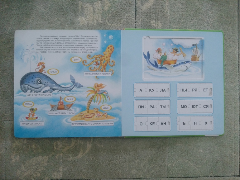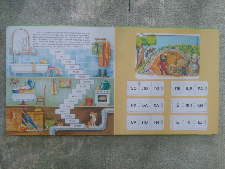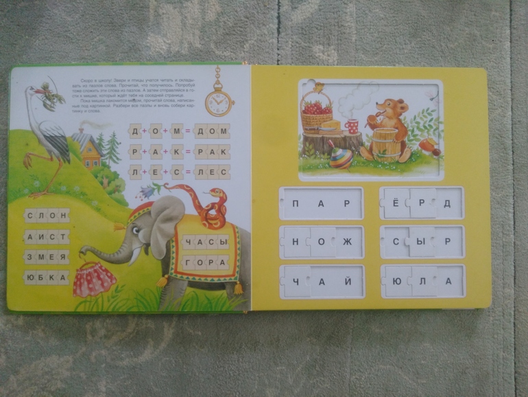 На каждом развороте слева задание, справа маленькие пазлы-слова и пазл-картинка.