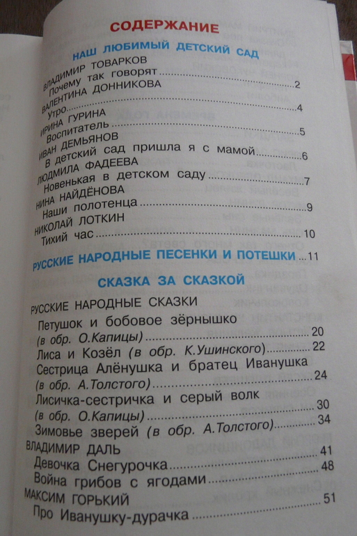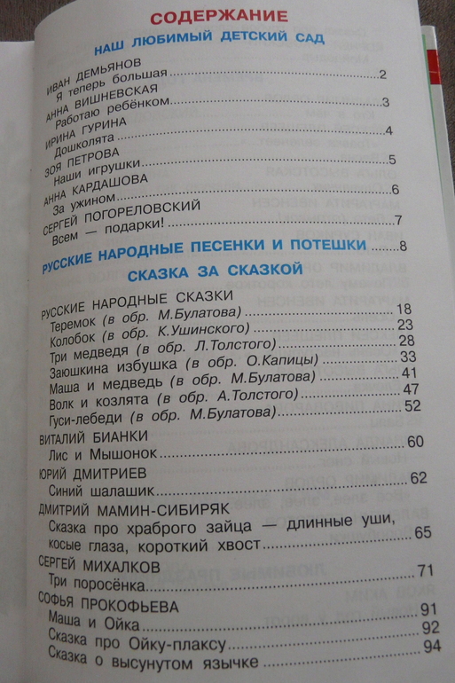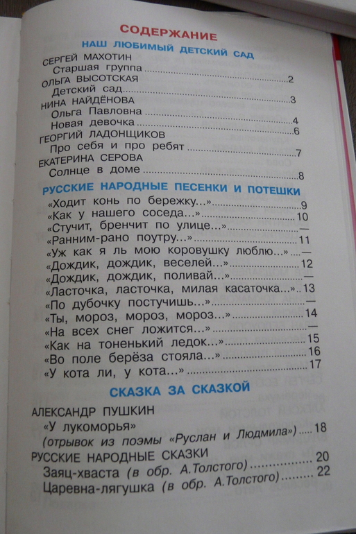 во всех книгах идут рубрики: 1.Наш любимый детский сад,2. Потешки ,3.Сказки,