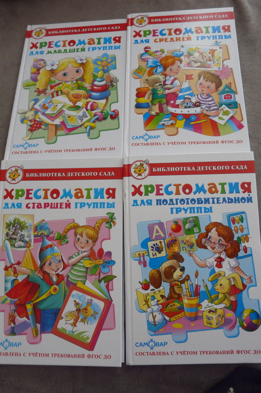 Обзоры (подборки книг на определённую тематику)В этом отпуске приобрела вот такие хрестоматии для детского сада.Они идут по группам:Младшая,средняя,старшая и подготовительная