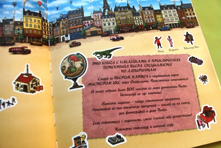 Стикербук - слово непривычное, но по другому не скажешь, т.к. здесь объединены и виммельбух, и расследование, и 800 наклеек, т.е. получается и не книга, и не тетрадь, а куча удовольствия. В этом стикербуке детектив Пьер снова чего-то расследует и кого-то ищет. Но это не продолжение первой книги, а вполне себе самостоятельная занималка.