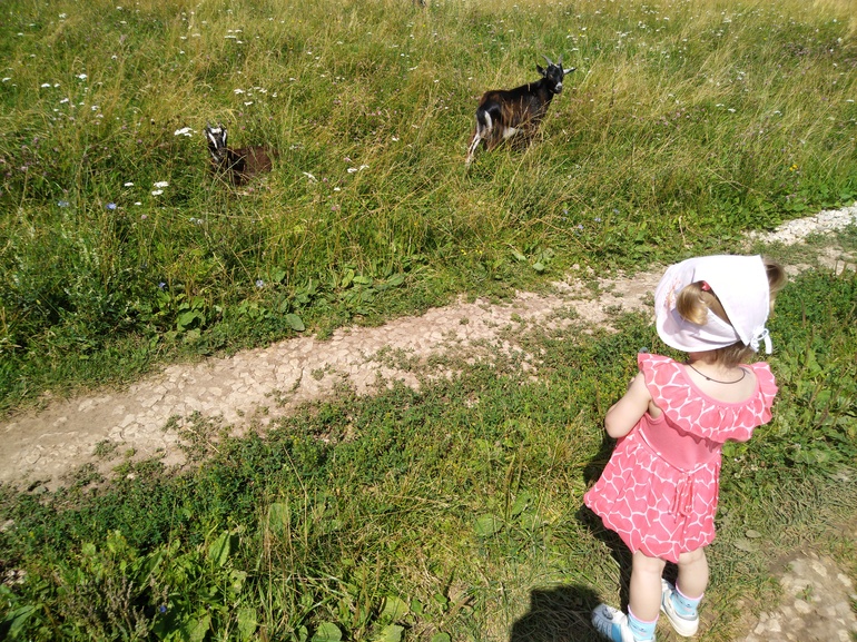 С нами ездила наша трехлетняя дочь. Все ей было интересно, все хотелось потрогать, в каждую дверь и калитку зайти, каждый кустик с ягодами обобрать и конечно же не обошлось без забавных ситуаций. Бабушка живет в двухподъездном доме, построенном еще в далеком 1965 году. В нем два этажа и 8 квартир. И наверное только в 4 из всех живут люди. В основном уже старенькие бабушки. И вот у каждой из них имеется какая-то живность. Перед домом бегают куры с петухом, козочки едят травку, утки носятся, а у одной бабушки даже есть собака, маленькая такая и очень шустрая собака. И вот наша девочка нашла себе игру, бегать за курами. Бегала, бегала, радостно смеялась. И тут вышел на прогулку этот Джек, именно так зовут собаку, видит все это хулиганство и как давай носиться за нашей девочкой. И вот мы из окошка наблюдаем: бегут куры, да ними дочка наша, и с лаем эту цепочку завершает Джек. Дочке уже совсем не весело, Джек недоволен, что куры как заведенные по всему двору разбежались, а мы гогочем))) Но в итоге никто не пострадал) к сожалению фотографий с Джеком не сделали.