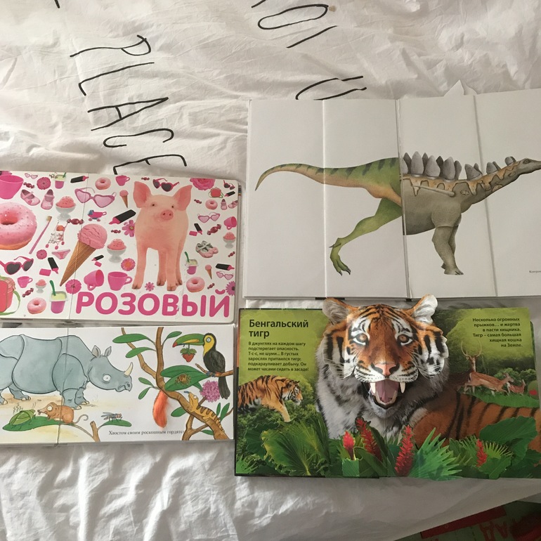 Есть ещё ферма Ван Флинта, Живая Книга, Азбукварик 3д с динозаврами, Азбукварик со звуками животных целая куча, Ротраут Книги всех Сезонов, про моря где светить фонариками, над и под землёй, едет книжечка Одень меня с замочками, шнуровками и тд.