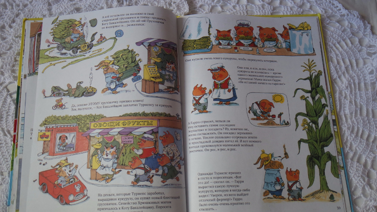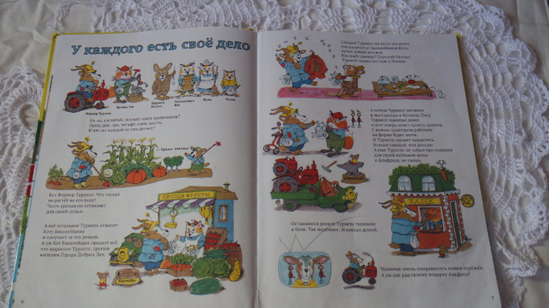 Первые развороты знакомят с жителями города и законами экономики. Фермер продал урожай и получил деньги. Часть денег он потратил на семена и трактор, часть денег он потратил на подарки, а часть положил на хранение в банк. Сказано, что на трактор фермер откладывал деньги...Так и я объясняю дочкам, что на большие игрушки и отпуск нужно денежки положить в копилку.
