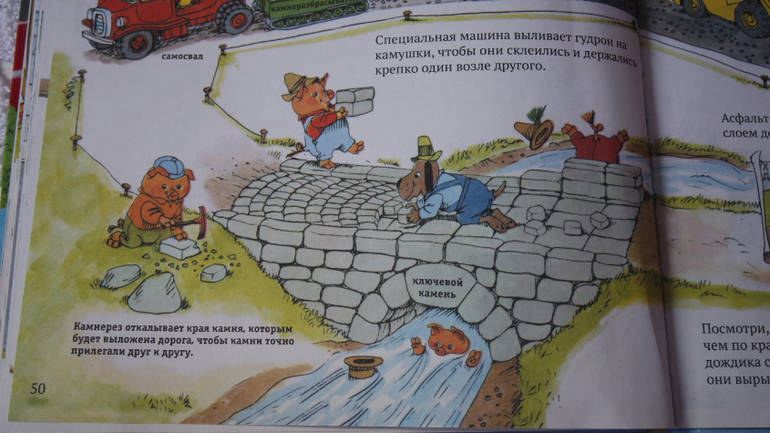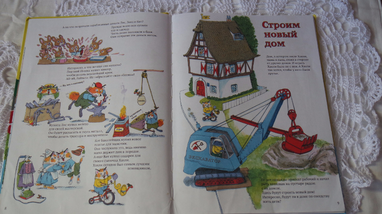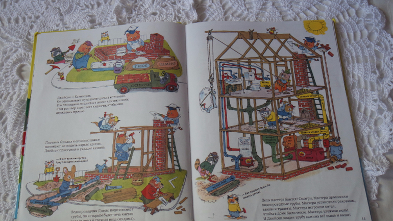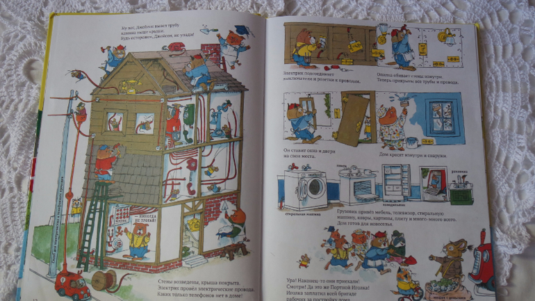 Первая история "Строим дом". Здесь проиллюстрированы все этапы строительства: фундамент, кирпичная кладка, каркас, коммуникации (эта тема особенно интересна детям!!!), крыша, электричество, монтаж окон и дверей, внутренняя и внешняя отделка, монтаж техники. Дом готов для новоселья! Смотрите сами...