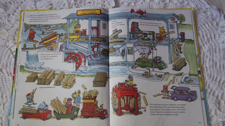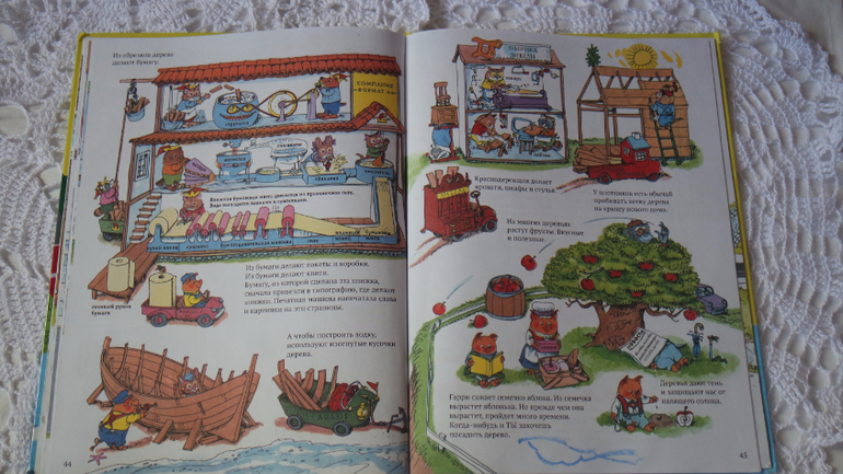 Лес и как мы его используем. Дети (и родители) узнают зачем нужны деревья, что делают из древесины. Автор проиллюстрировал как рубят и распиливаю деревья, как сплавляют по реке, как работает лесопилка, как делают бумагу, что делают из бумаги, производство мебели.