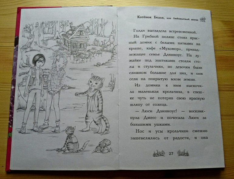С дочкой книгой читали по очереди: главу она, главу я. Шрифт в книге крупный, текста на странице немного, иллюстрации черно-белые не отвлекающие от текста и не утомляющие глаза. Первую книгу мы читали несколько месяцев назад, но дочка до сих пор помнит о чем шла речь. Историю про девочек и котенка Беллу тоже прослушала с удовольствием. Думаю, что мы не остановимся на двух книгах из серии и, по возможности, будем читать остальные.