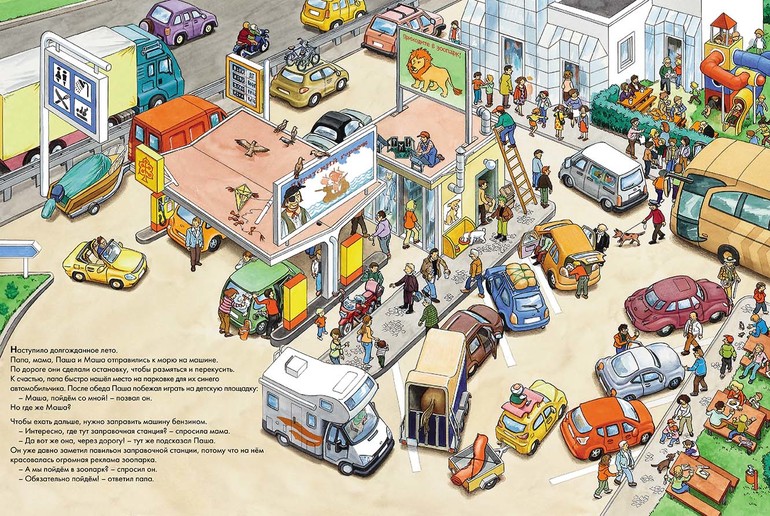 На автостоянке и в кемпинге, в зоопарке и аквапарке, в «Пиратском городке» и на пристани - повсюду Паша видит множество интересных вещей и очень хочет поделиться впечатлениями с Машей. Но Маша всё время куда-то убегает. Где же она? На каждом из семи разворотов нужно помочь Паше найти Машу и рассказать обо всём, что удалось увидеть вместе с героями книги.