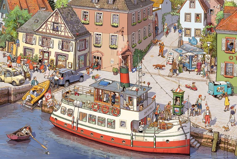 Кроме Паши, Маши и их родителей от разворота к развороту (даже начиная с обложки) в этой книге «путешествуют» и другие персонажи. Например, старичок в клетчатом пиджаке и с тростью; мама с двумя близнецами; мужчина в фуражке с собакой; юноша с зелеными волосами и белым пуделем. Попробуйте проследить их истории. А может быть, вы заметите и других «путешествующих» персонажей?