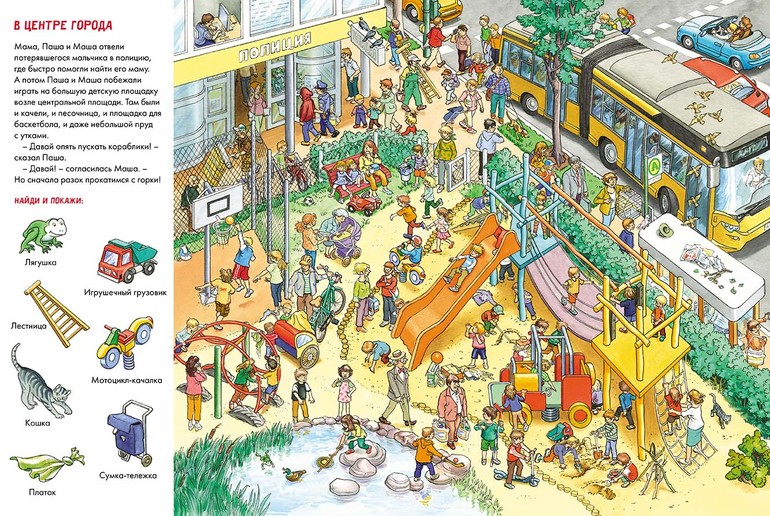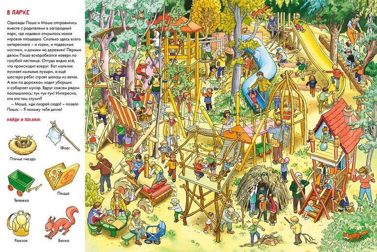 Детей на каждой площадке видимо-невидимо! Нужно внимательно рассмотреть, кто чем занимается, отыскать среди них главных героев - Машу и Пашу - и выполнить задания «найди и покажи» на каждом развороте.