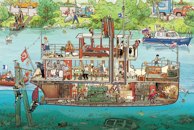Книга «На реке» расскажет о том, как провели свой день пассажиры теплохода «Ласточка». Рано утром они пришли на пристань небольшого городка, купили билеты и поднялись на борт, где их приветствовали капитан и команда. Затем теплоход отчалил и поплыл вниз по течению, делая по пути остановки - на ферме, у паромной переправы и возле аквапарка под открытым небом. Не обошлось без происшествий: в пути у «Ласточки» сломался винт, и понадобилось вызвать водолазов, чтобы его починить. Наконец, вечером, после всех приключений «Ласточка» прибыла к месту назначения - в большой морской порт, и пассажиры как раз успели к началу большого музыкального фестиваля.