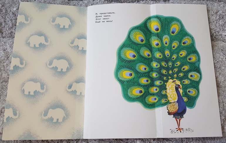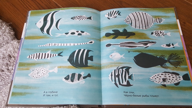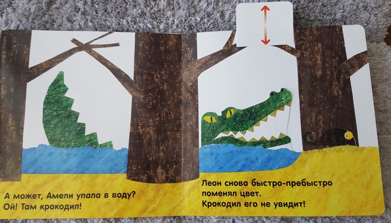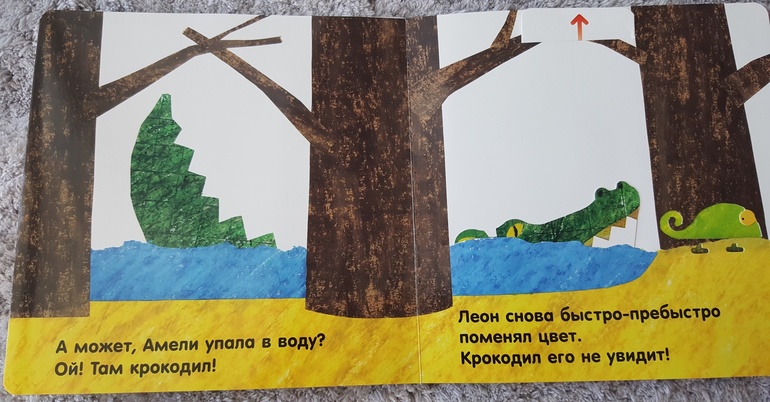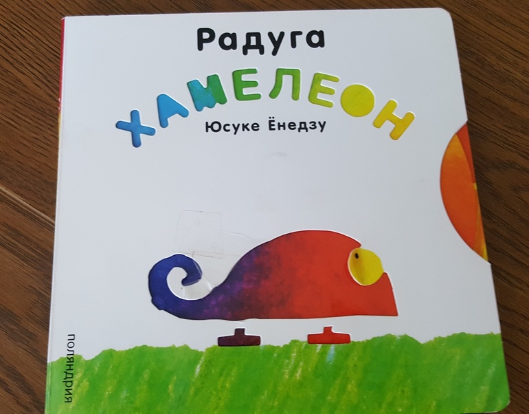 В книжке "Хамелеон" любит покрутить колесико и наблюдать за изменением цвета. Купила в книжном магазине за смешную цену, так как книжка была с небольшим дефектом. Но за те деньги, что продавали интернет-магазины эти 4 разворота никогда бы не купила. Хотя книжка и правда с интересной задумкой. Хамелеон может даже измениться под цвет штрих-кода с обложки.