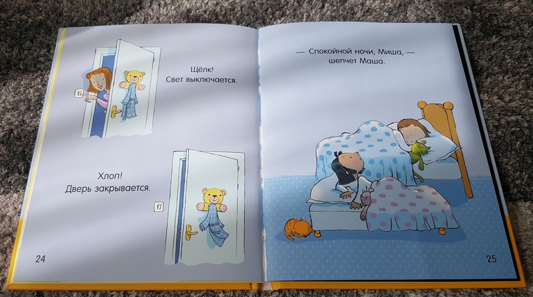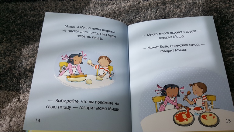 Любит, когда я ей читаю истории про Машу и Мишу. Эти истории уже намного сложнее, чем книжки про Макса, не все ей понятно, но сам факт того, что героями являются малыши решает за все.