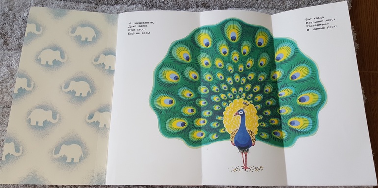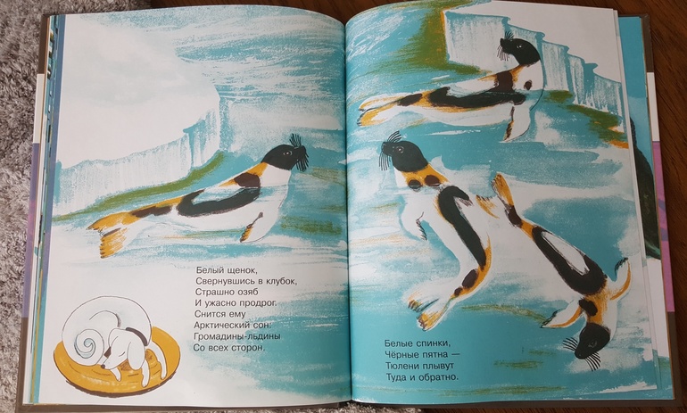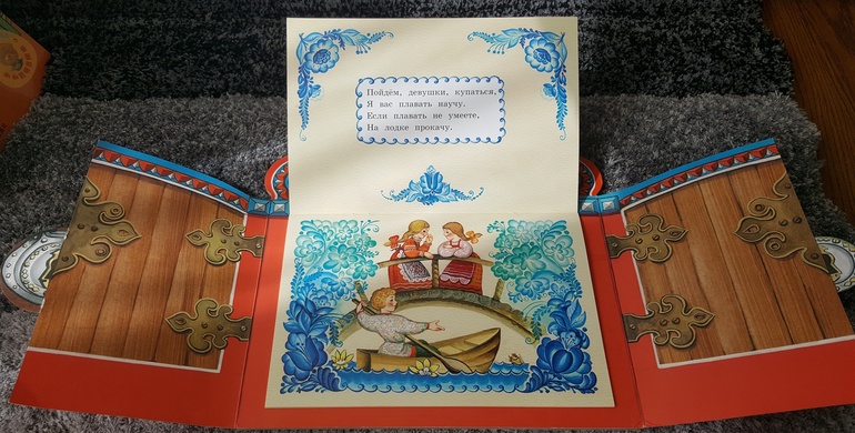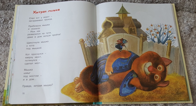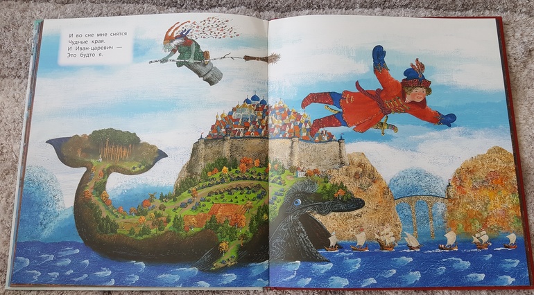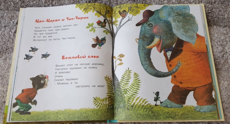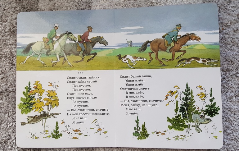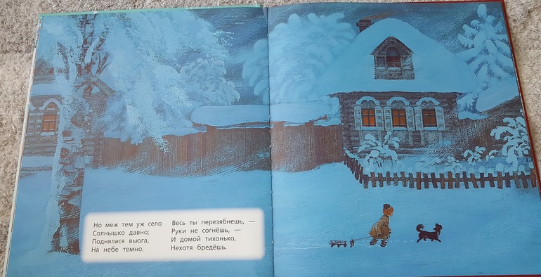 "Детство" не планировала предлагать так рано. Книжку сама вытянула с полки и несколько раз рассматривала. Да и как могут не понравится такие великолепные иллюстрации, да еще и в таком огромном формате. Потом много раз я ей читала сам стих, она слушала до конца, и даже запомнила Бабу Ягу и Ивана Царевича на сером волке.