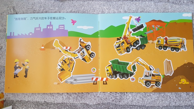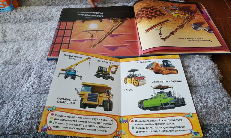 Подключили к чтению этой книжки всю нашу тяжелую артиллерию в виде завалявшихся машинок, книжки от Росмэн "Полезные машины" и сюжетных наклеек: