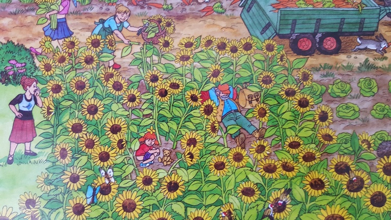 Этот виммельбух мы смотрим постоянно. Нашли много смешных моментов. Недавно увидела, что он и в России продается под названием "Однажды в деревне", немного расстроилась, что тащила за ту же цену из Китая.