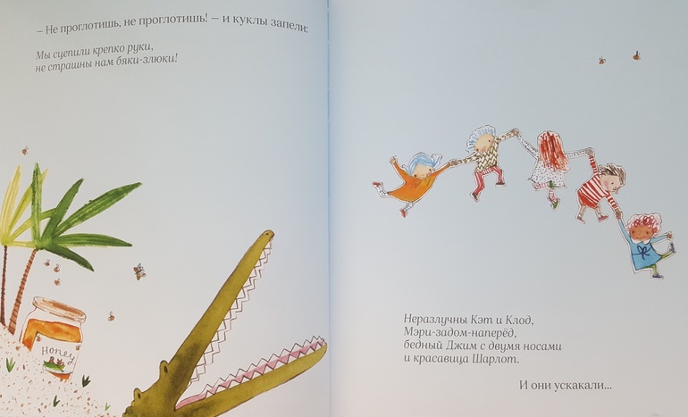 Открытием месяца стала книга Джулии Дональдсон "Бумажные куклы". Эта книга совершила небольшой переворот в сознании моего ребенка. Через некоторое время после прочтения она сама зашла в комнату, где стоял шкаф, в одной из полочек которого я прятала книгу "Где обедал, воробей?". Раньше она боялась даже открывать книжку, настолько сильно напугал её крокодил с последнего разворота. Много раз я пыталась поменять отношение к книге. А в этот раз она сама открыла шкафчик, сначала робко посмотрела прямо в открытом шкафчике, а потом, осмелев, забрала книжку и принесла мне в другую комнату почитать. Оказывается, она всегда помнила про эту книгу и, возможно, с ней были связаны непонятные нам душевные переживания. А после этого уже крокодила пришлось спасать много раз, теперь он лежит со сломанной челюстью.