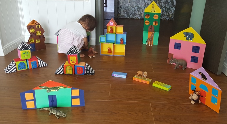 Почти дочитали книжки от Умницы. Вот эту обыграли с помощью картонных домиков.