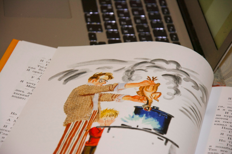 Рося смеялся как доставали папа с Дениской курицу из под шкапа! Мыли, терли мылом... Курица полиняла в некоторых местах... С потрохами засунули в кастрюлю... Знакомо мамы? У кого папы так могут)))))