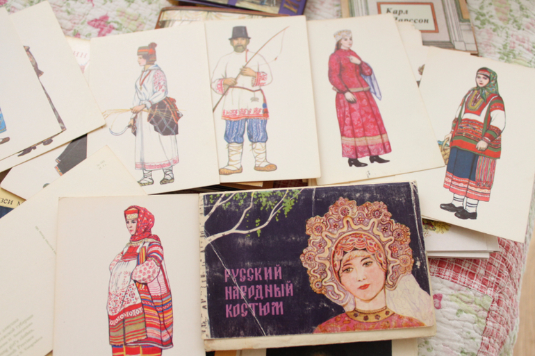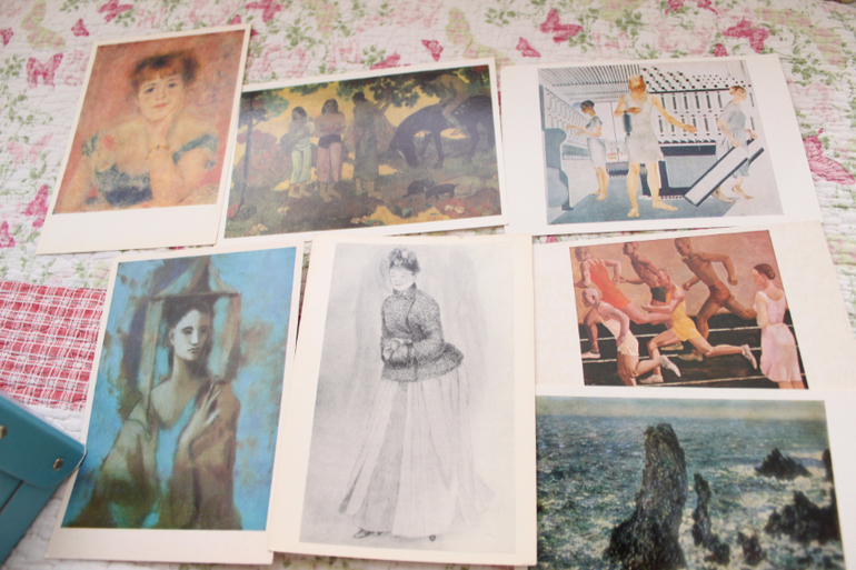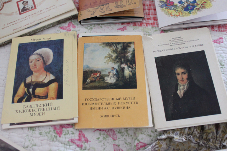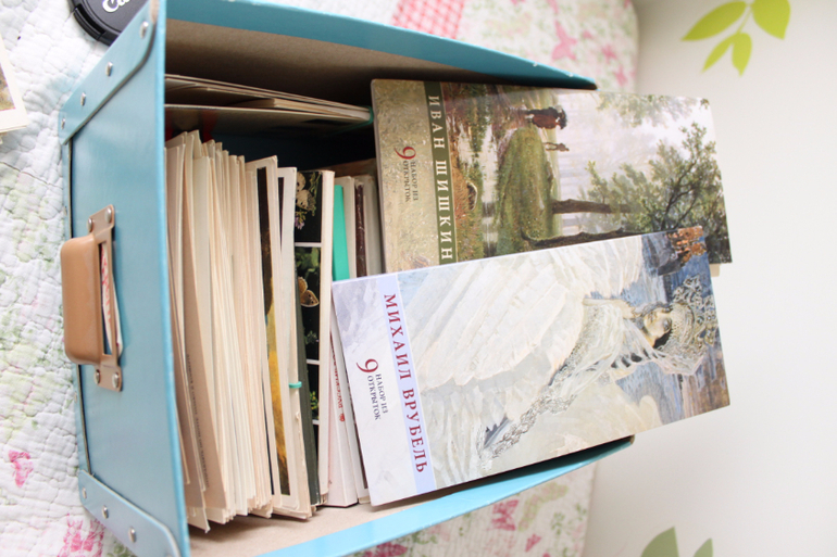 Большим подспорьем в формировании интереса стали открытки. Ещё из моего детства осталась коробка сокровищ ( был у мамы на работе сотрудник, который мне их подарил, сам заядлый путешественник и любитель музеев, его дети к тому времени выросли, почему именно мне не знаю, но я до сих пор вспоминаю наши беседы, перебираю открытки с благодарностью). Качество печати, конечно уступает современному, но для детских ручек и первого знакомства открытки удобнее больших и тяжёлых альбомов. Теперь уже мы с Димой пополняем коробочку после каждого посещения несколькими открытками. Теперь они рассматривают их вдвоём с Федей и Дима на правах старшего делится знаниями и надеюсь любовью к живописи.