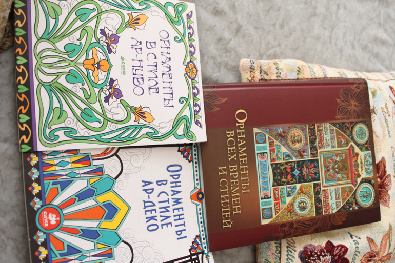 И тут пришло время поговорить об орнаментах, у нас был целый период рисования и выкладывания из мозаики симметричных рисунков, а потом купили спирограф и начался новый этап увлеченя орнаментами и симметрией, пришлось маме читать про орнаменты и рассматривать месте следующий альбом (текста нем мало ).