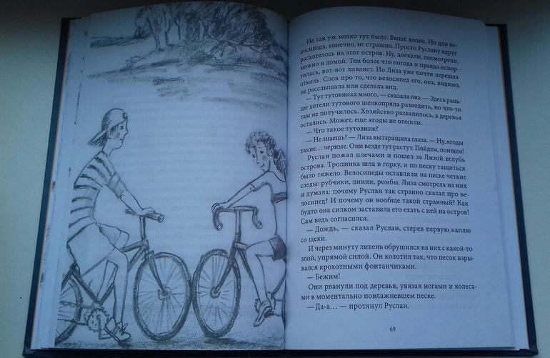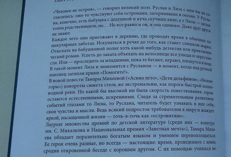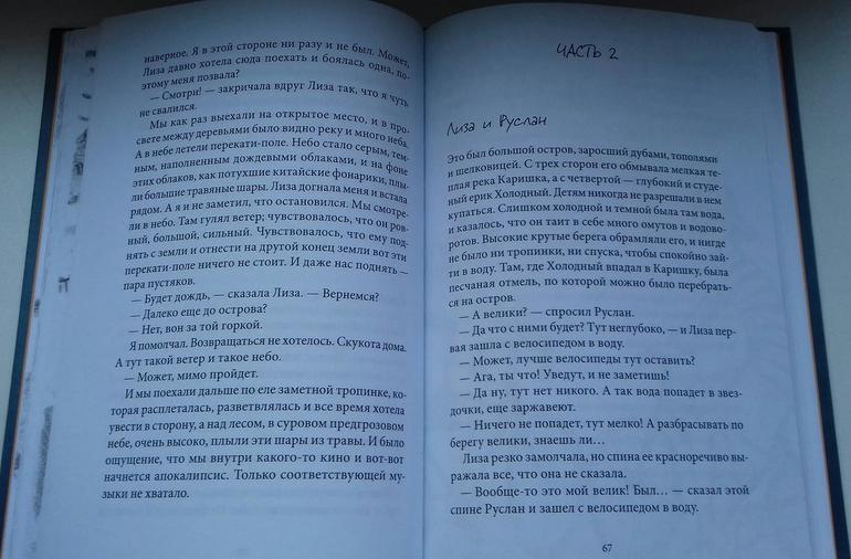 Действительно, здесь 2 главных героя-подростка, Лиза и Руслан, проводящие лето в деревне. У Лизы в доме каждое лето полно народу: многочисленные дяди-тёти, их мелкие и не очень дети... Они даже спят все в рядок на полу, и всё это замечательно и весело, Лиза всех их любит. Однако ей( как, наверное, любому подростку) кажется, что она-то - самая нелюбимая и самая некрасивая среди своей родни. Руслан один у родителей. У них дома тишина и покой, даже маленький двоюродный братик на этом фоне воспринимается как сильный раздражитель. Руслан и Лиза знакомятся при достаточно экстремальных обстоятельствах, но и после этого остаются просто соседями. Они - два острова в большом океане. И повествование строится поочередно от лица то Лизы, то Руслана.