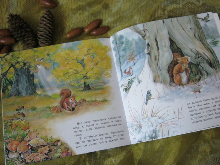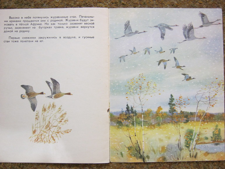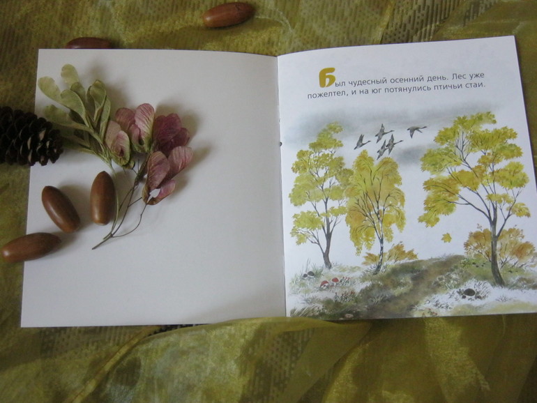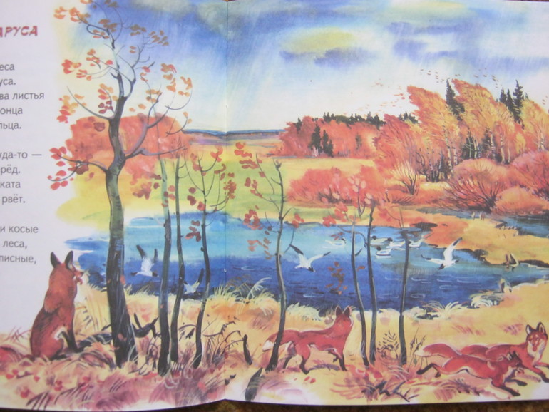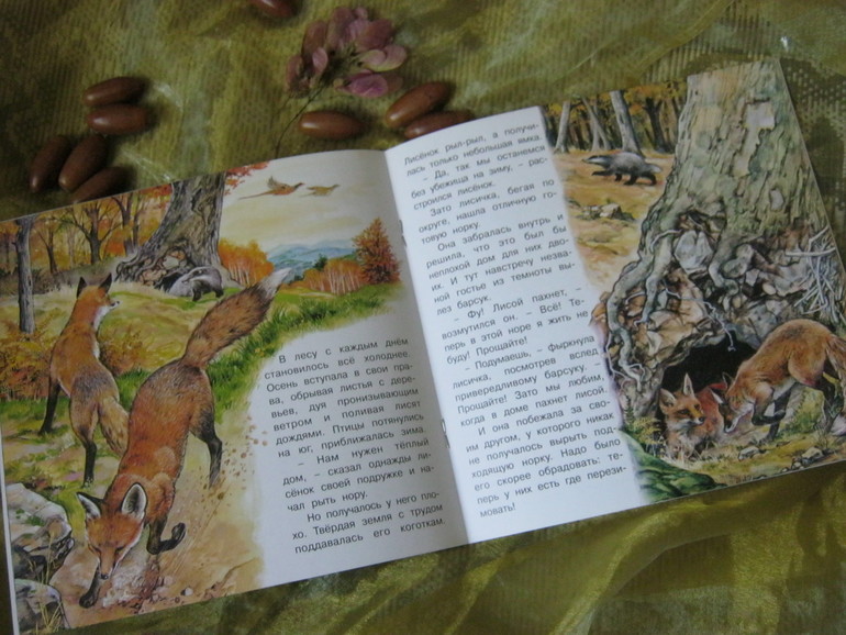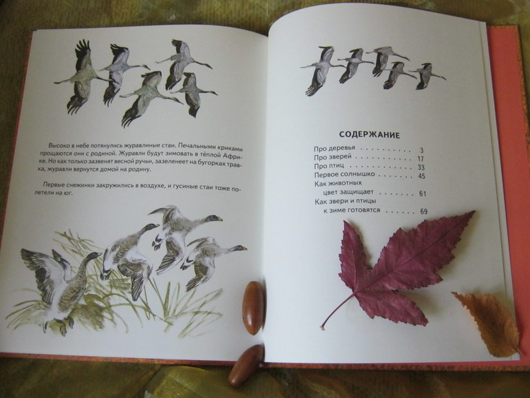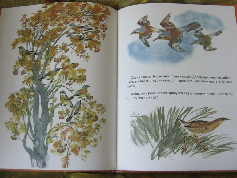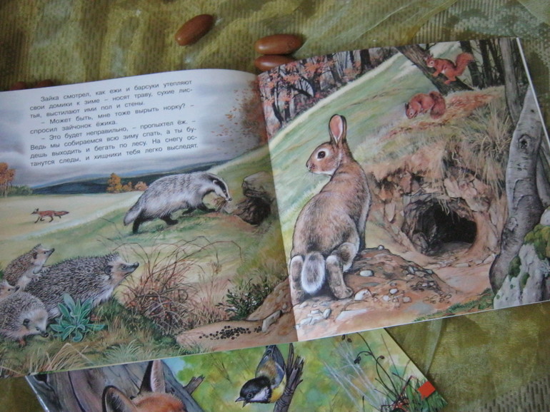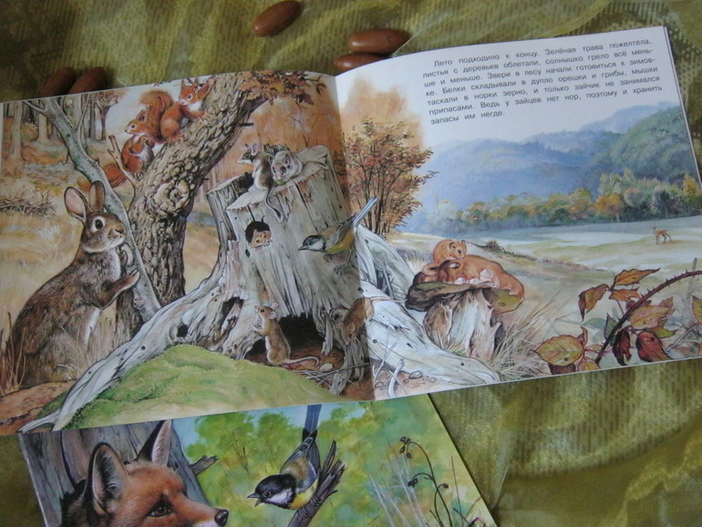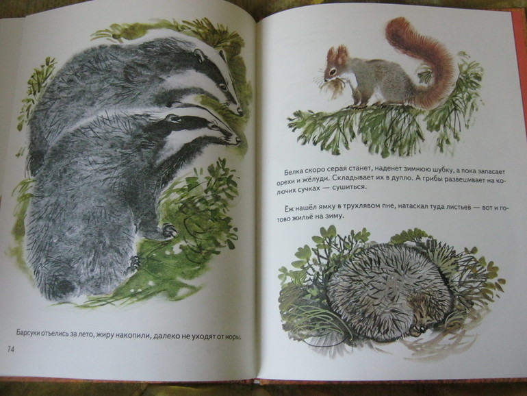 и про другие деревья, и про животных, и про то, как птицы и звери к зиме готовятся. По одному-два предложения про зверя или птицу и большая картинка.
