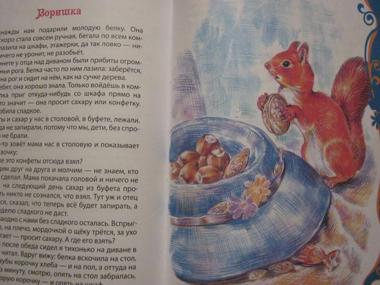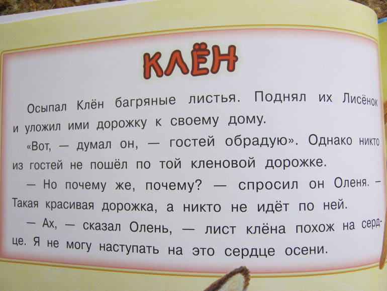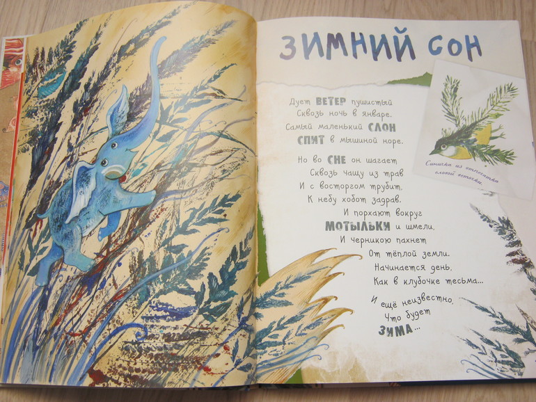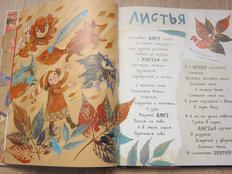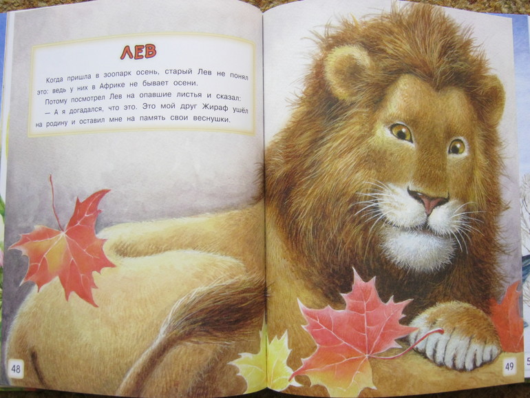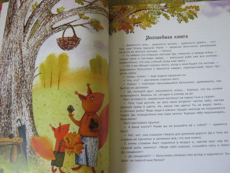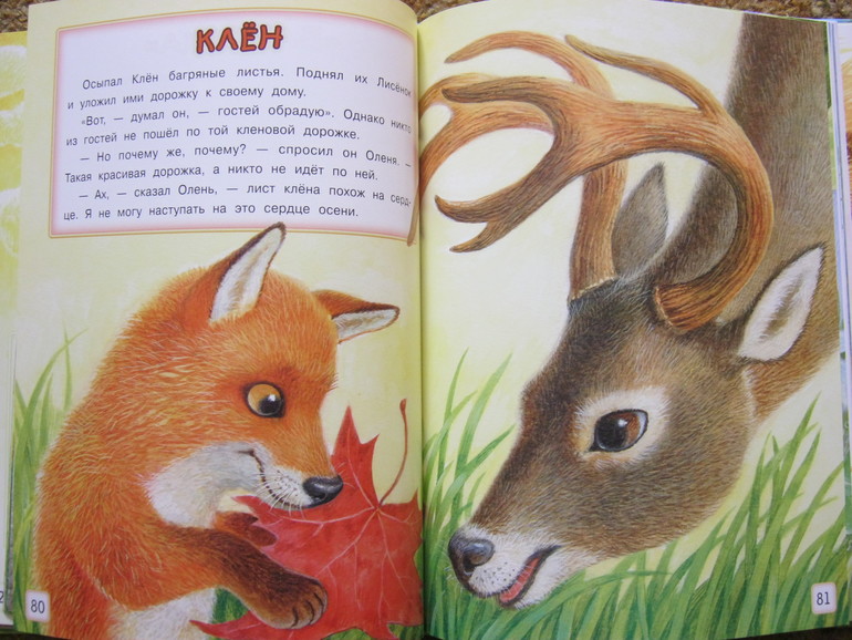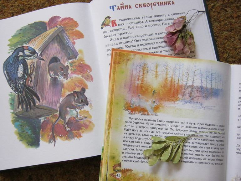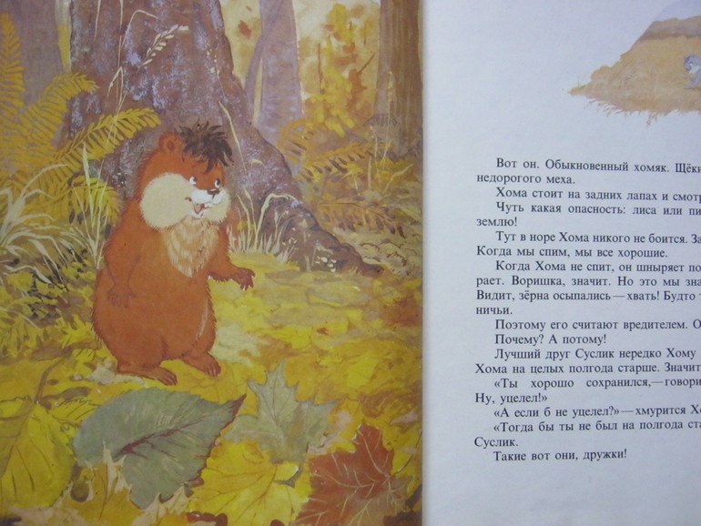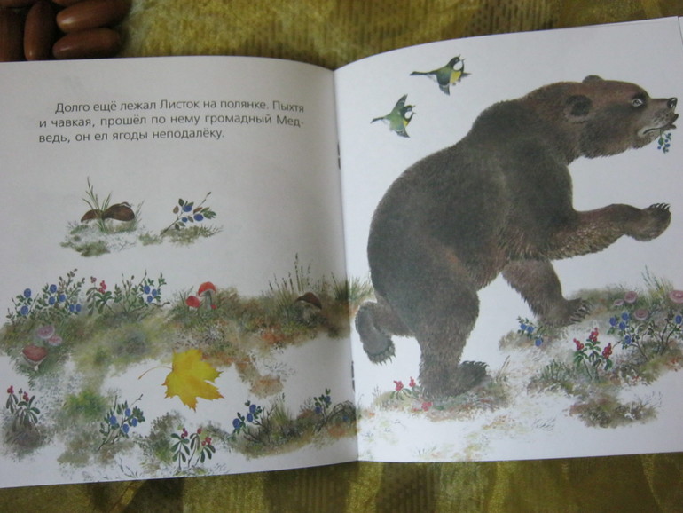 и про другие деревья, и про животных, и про то, как птицы и звери к зиме готовятся. По одному-два предложения про зверя или птицу и большая картинка.