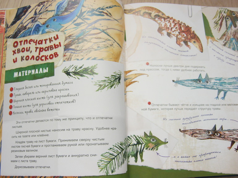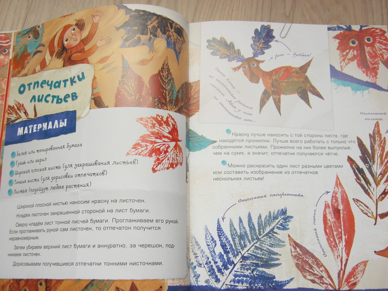 Кроме того, это пособие по арт-терапии. Да-да-да! Попробуйте подуть на кляксу, насыпать соль на яркую акварельную лужицу, покрасить листья, прижать их к бумаге - и убедитесь сами.