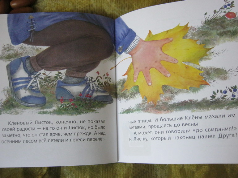 Очень простая и очень понятная детям сказка про осенний кленовый листок, оторвавшийся от ветки. Он не катился, как колобок, а лежал на одном месте, но общался с самыми разными обитателями леса, пока его не нашел мальчик, который с мамой собирал в лесу грибы.