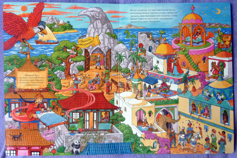 Третий: Восток. Маленький Мук, Али Баба и сорок разбойников, Волшебная лампа Алладина, Калиф-аист, Сундук-самолет, Синдбад-мореход. Еще вижу яйцо птицы Рух справа... И справа внизу процессия со слоном под вопросом. Панда тоже удивляет, китайский там джинн какой-то...