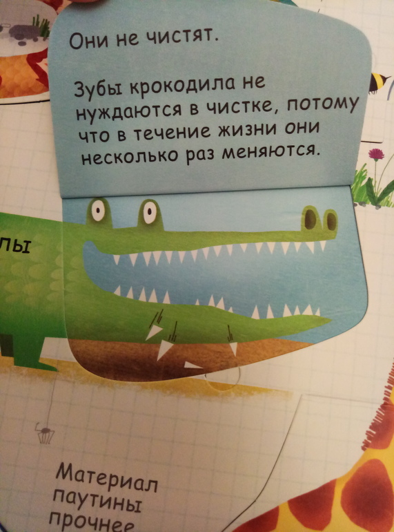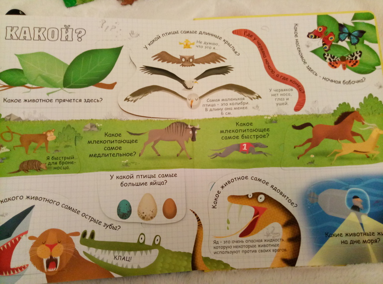 Вторая книга Вопросы и ответы о животных, серия Книга с секретами, 60 волшебных створок. Люблю эту серию, покупала не глядя) а получив, озадачилась. Книга не дает обобщенных знаний по теме, а только ответы не некоторые вопросы. Из нее не узнаешь, какие животные живут в лесу или пустыне, к какому виду относятся, но можно узнать, что заставляет светлячков светиться и все ли комары кусаются, да, и еще сколько ножек у многоножки(750 максимально,кто же их пересчитал)))