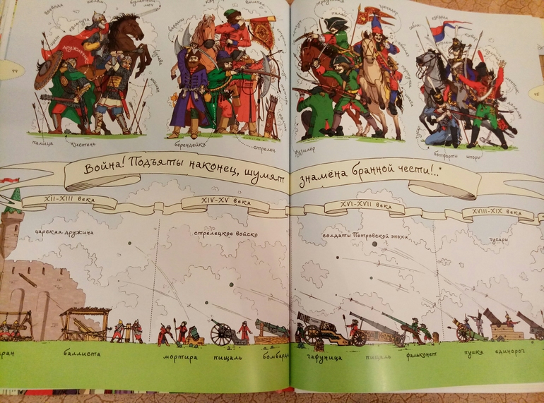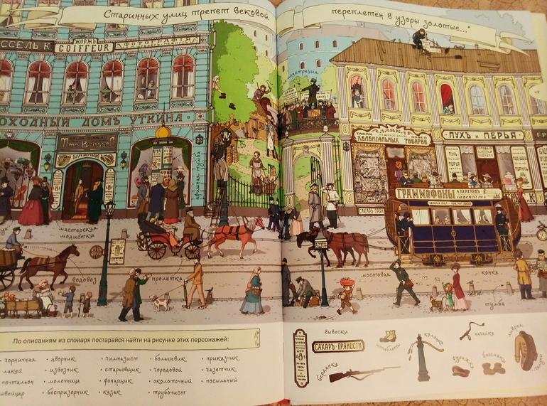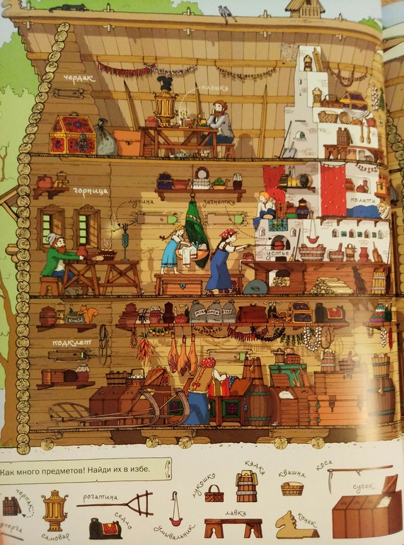 Помимо всех плюсов виммельбухов, таких как развитие внимания , памяти, мышления, речи, здесь еще и очень познавательно!дети в игровой форме получают исторические знания, узнают те слова и понятия, которые потом будут им встречаться в книгах. И они уже не будут спотыкаться на них...Ведь как часто здесь обсуждалось, что даже сказки Пушкина современным детям читать тяжело именно из за непонятных слов. А представляете, сколько непонятных слов добавиться нашим детям!