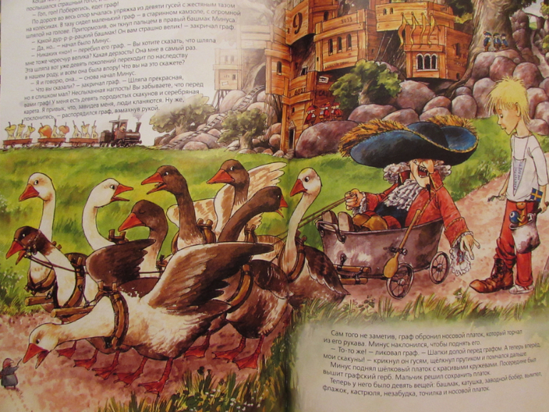 На первом развороте Минус прощается с дядюшкой Примусом, который ценит каждую вещь за ее уникальность и дарит мальчику ОДИН башмак.